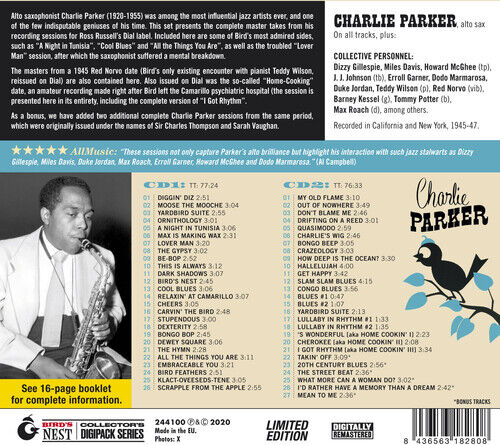 The masters from a 1945 Red Norvo date (Bird’s only existing encounter with pianist Teddy Wilson, reissued on Dial) are also contained here. Also issued on Dial was the so-called “Home- Cooking” date, an amateur recording made right after Bird left the Camarillo psychiatric hospital (the session is presented here in its entirety, including the complete version of “I Got Rhythm”.