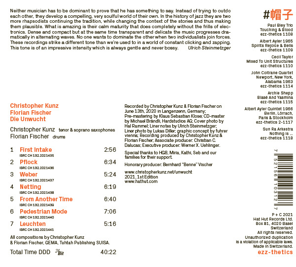 The young German duo of tenor saxophonist Christopher Kunz and drummer Florian Fischer parallel the Laubrock-Rainey model rather than the Golding-Boyd one. Their starting point is one of delicacy and subtlety and melodicism and, except for a down and dirty moment during "Netting" midway through Die Unwucht, that is the space they inhabit throughout the album.