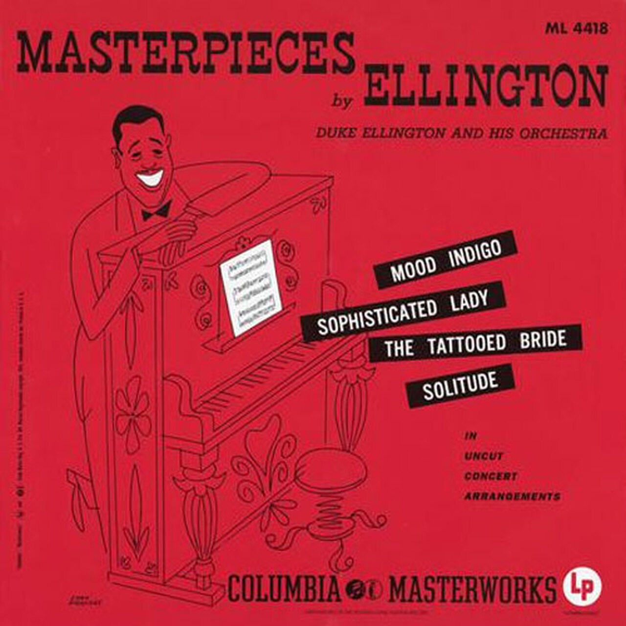 Suddenly, for the first time in his career, Ellington was able to forgo the 3 minutes-and-change restrictions afforded by the short running time of the 78 RPM disc. He and his band rose to the occasion with extended (11-minute plus) 'uncut concert arrangements' of three of his signature songs -- "Mood Indigo," "Sophisticated Lady," with evocative vocals by Yvonne Lanauze, as well as "Solitude." Masterpieces was also notable for the debut of the full-bodied, surprise-laden "The Tattooed Bride," and for the swansongs of three Ellintonian giants of longstanding: drummer Sonny Greer, trombonist Lawrence Brown and alto saxist Johnny Hodges (the latter two would eventually return to the fold).