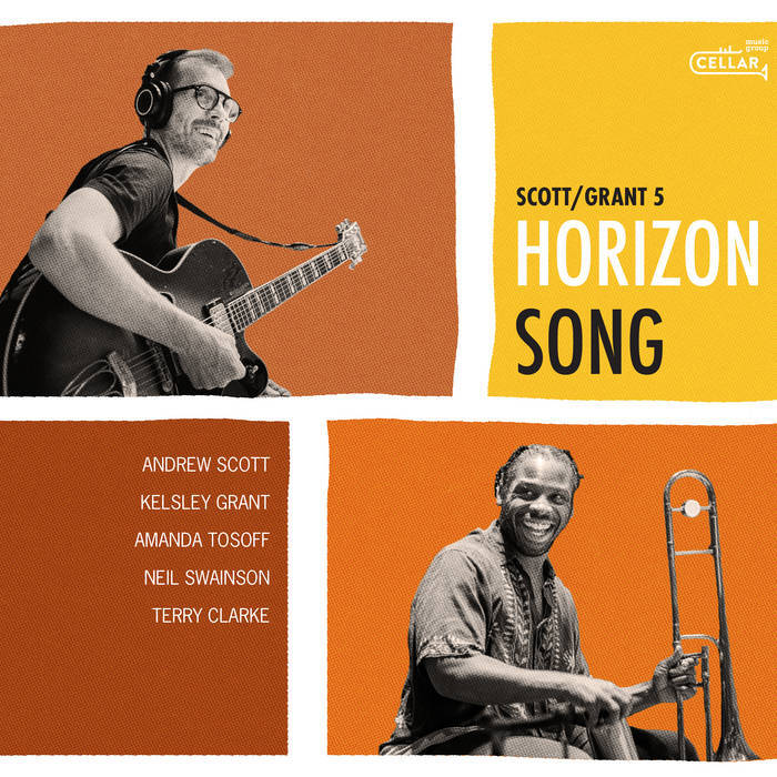 Andrew Scott and Kelsley Grant are very at home in this jazz multiverse. Not that they try to represent all the jazzes in these tunes, but rather see the myriad of possibilities and calmy select the sounds and moments that feel right. As both professors and students of jazz, Scott and Grant can recite the date of the session where Lionel “Skipjack” Dickens first wrenched overtones from his French horn on the third chorus of “Portabello Mushroom,” and the exact take in which it happened. (None of those things are real, by the way.) But Scott and Grant, the players, move past all this knowledge to where the sounds are sweetest. The music on Horizon Song is notable for its complete lack of anxiety, its dominant mode of cool. There is not a drop of sweat to be found on any of these tracks. Each one moves without haste through ear-candy melodies into deliciously tasteful and non-wanky soloing from Scott/Grant and their massively accomplished collaborators. There are touches of Bossa Nova and Bebop, both feeling somehow fresh and reverent at the same time. At times, it seems almost as though Scott and Grant are attempting a rewrite of jazz history that elides dissonance. Even the one up-tempo number, “Punctuality”, binds itself to a clean swing, and never for a moment uses skronk and distortion as an accelerant. But just as that thought arises in the mind, we suddenly get the sound of an electric piano — included, not as a nod to Herbie’s funk period, but simply because it sounds so good.