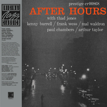 After Hours is a 1957 album from the Prestige All Stars – led by trumpeter Thad Jones. Also including Frank Wess (flute, tenor sax), Mal Waldron (piano), Kenny Burrell (guitar), Paul Chambers (bass), and Art Taylor (drums), the album features 4 cuts, all composed by Mal Waldron. This new edition of the album is released as part of the Original Jazz Classics Series pressed at RTI with all-analog mastering from the original tapes at Cohearent Audio and a Stoughton Tip-On Jacket.