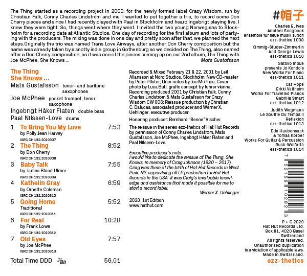 The music on this ezz-thetics by Hat Hut Records Ltd re-release was recorded in 2001, the result of a stateside meeting between McPhee, Gustaffson and Nilssen-Love, all three of whom would take part in Peter Brötzmann's fabled Chicago Tenet, an impressive band of improvisers who stormed many a venue in the early noughts, bringing creative music to the masses, including this writer, who had the privilege of hearing the band during an extended night residency at the Suoni per il popolo festival in Montreal, a first exposure to the creative music genre that couldn't have been at the hands of more skilled and sensitive real-time composers.